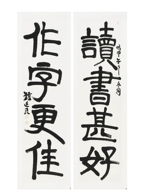 鐘廷良學(xué)書(shū)的過(guò)程離不開(kāi)他的收藏,也得益于他的收藏!2011年收得清代書(shū)壇巨匠伊秉綬一副對(duì)聯(lián)后,細(xì)細(xì)研摩臨寫(xiě)。此后,也有所悟所得。2012年收得民國(guó)舊拓“泰山金剛經(jīng)”集聯(lián)后,對(duì)泰山金剛經(jīng)刻石奉為至尊,敬若神明。爾后,凡作大字,皆以其為架構(gòu),而其書(shū)也漸有可觀者。由于長(zhǎng)期從事文字工作之關(guān)系。讀書(shū),亦成了鐘廷良生活的一部分。其深知唯有讀書(shū)方能為書(shū)法注入養(yǎng)分。唯有知識(shí)方能豐富書(shū)法內(nèi)涵。鐘廷良的書(shū)法,尊崇于中國(guó)傳統(tǒng)文化所倡導(dǎo)的書(shū)論和畫(huà)理。在學(xué)習(xí)古人、先賢經(jīng)典的基礎(chǔ)上,小心求索,認(rèn)真創(chuàng)作。既注重以古為師,又融匯時(shí)代精神,孜孜不倦,其書(shū)漸入佳境。