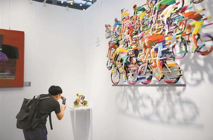 參展商“譽美國際”的展臺外墻上,一場疾馳中的跑馬比賽正酣。將不銹鋼板切片組合,飾以熱情而愉悅的色彩,這兩組風格極具個性化的墻面雕塑作品,均來自以色列國寶級藝術家大衛·格斯坦,引得不少觀眾駐足欣賞。