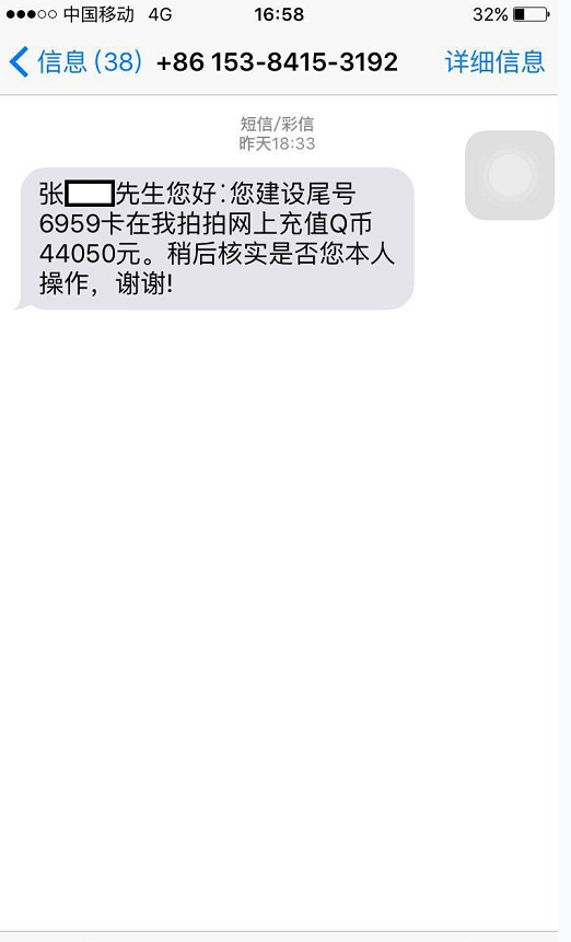 一天,客戶張先生收到一條手機號碼為15384153192發(fā)來的短信:“張先生您好∶您建設(shè)銀行尾號6959卡在我拍拍網(wǎng)上充值Q幣44050元,稍后核實是否您本人操作,謝謝!”起初,張先生見是陌生手機號發(fā)來的短信,就并未在意,可隨后卻收到建行95533客服中心發(fā)來的短信提醒,稱他的銀行賬戶發(fā)生了一筆44050元的轉(zhuǎn)賬支取業(yè)務(wù)。