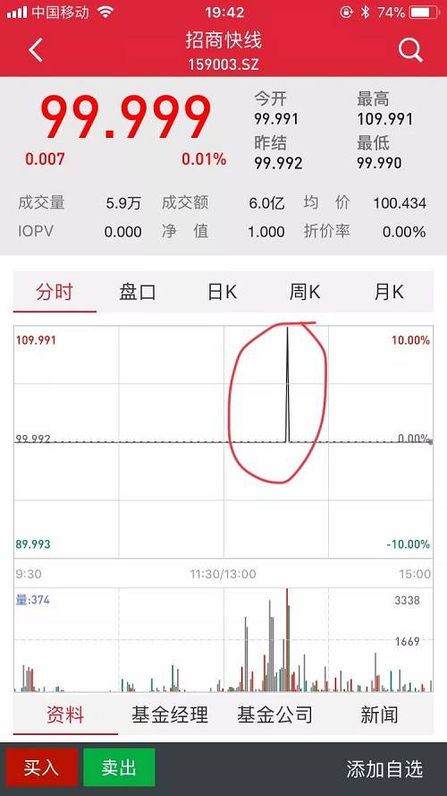 基金君大致講一下這個過程。2018年3月13日,招商保證金快線A在二級市場盤中價格出現了109.991的超高成交價,成交金額5511.95萬元,業內人士看來,這大概率是由“烏龍指”所致,不過,這不小心的手一抖,粗略估算就要浮虧約500萬,一套房就這么沒了。