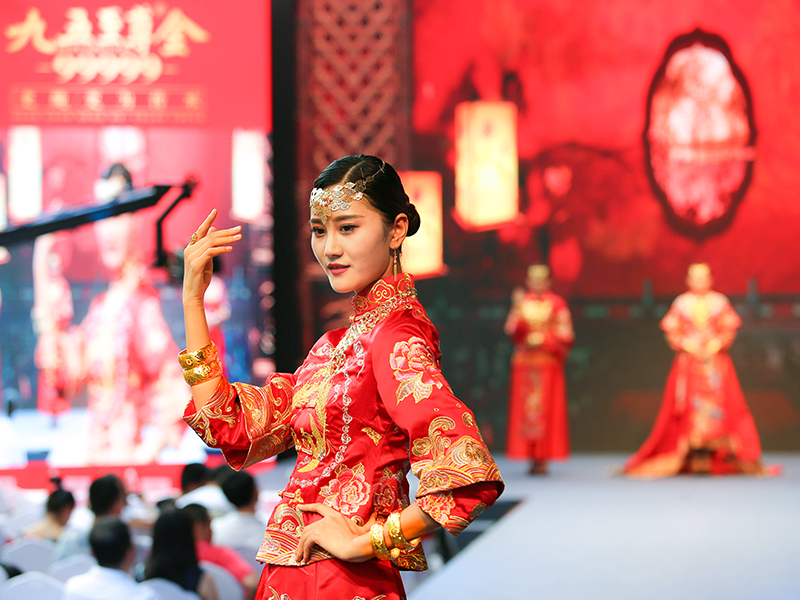 黃金文化與中國傳統婚慶文化淵源久遠,從古自今,黃金有情比金堅之意,有滿滿的喜慶之感,在嫁娶之時通常作為聘禮中的重頭戲。結婚三金通常指的是項鏈、手鐲、戒指,寓意夫妻情比金堅,一生一世永相隨之意,因此這美好的寄愿習俗一直被傳承至今。黃金又是財富、身份的象征,結婚佩戴黃金首飾,彰顯家族的財富、地位與榮譽,飽含家族人濃郁的情感與欣喜,可代代傳承!九五至尊金至囍新娘演繹的中華黃金婚慶文化,唯美唯俏,牽動著每個人的心,掀起了中華黃金婚慶文化的熱潮。