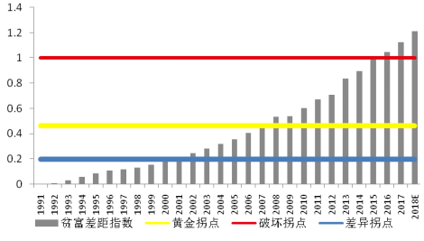研究發(fā)現(xiàn),貧富差距指數(shù)與經(jīng)濟(jì)發(fā)展存在這三個(gè)拐點(diǎn):差異拐點(diǎn)(0.2)、黃金拐點(diǎn)(0.463)及破壞拐點(diǎn)(1)。當(dāng)貧富差距指數(shù)在0.2以下的低值區(qū)時(shí),絕對(duì)平均造成動(dòng)力不足。當(dāng)貧富差距指數(shù)高于0.2時(shí),差異的動(dòng)力效應(yīng)開始顯現(xiàn),貧富差距指數(shù)與GDP增長(zhǎng)率存在顯著的倒U型的非線性關(guān)系。而且拐點(diǎn)在貧富差距指數(shù)等于0.463左右,對(duì)應(yīng)的時(shí)間為2006-2007年之間,貧富差距在這個(gè)水平左右對(duì)經(jīng)濟(jì)增長(zhǎng)的動(dòng)力效應(yīng)最高。當(dāng)貧富差距指數(shù)低于1時(shí),貧富差距處于合理狀態(tài),合理的貧富差距提高了居民的工作動(dòng)能,有利于促進(jìn)經(jīng)濟(jì)增長(zhǎng),但超過(guò)臨界值1,隨著貧富差距進(jìn)一步提高,貧窮人口會(huì)有日益強(qiáng)烈的被剝削感,在一定程度上抑制了經(jīng)濟(jì)總量的提升。據(jù)此,近年來(lái)我國(guó)貧富差距的演變過(guò)程可以分為四大階段,分別是“財(cái)富絕對(duì)平均階段”(1991-2001年)、“差異帶來(lái)動(dòng)力,逐步接近黃金拐點(diǎn)階段”(2001-2007年)、“貧富差異擴(kuò)大階段”(2007-2015年)及“貧富分化相對(duì)嚴(yán)重階段”(2015年至今)。經(jīng)研究團(tuán)隊(duì)測(cè)算,2018年貧富差距指數(shù)預(yù)計(jì)已超過(guò)破壞拐點(diǎn)。