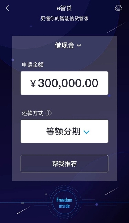 全新升級Freedom引擎后的e智貸,借助其自身的Freedom核心推薦的強大功能,通過極速的信息搜集和計算,可秒級判斷可貸額度,并為客戶量身推薦e招貸、e閃貸、分期還款等多種產品。
