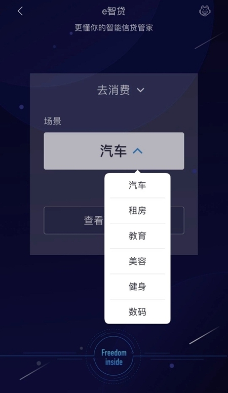 在客戶點擊e智貸后,Freedom還會根據客戶需求通過點擊「去消費」就能推薦汽車、租房、教育、美容、健身、數碼等服務,助力客戶開啟品質生活。