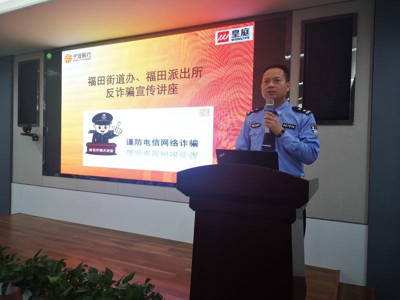 深圳新聞網訊 近年來,信息詐騙案件多發,詐騙分子手段層出不窮,不僅給廣大市民造成了財產損失,更加將社會的反詐騙宣傳教育工作推向重要位置。為了普及廣大金融消費者的反詐騙知識,同時讓知識宣傳更接地氣,近日,寧波銀行深圳分行攜手深圳福田街道辦、福田派出所對皇庭中心大廈100多位商戶代表,開展了一場教育意義深刻的反詐騙知識講座。福田區副所長羅躍、福田派出所社區隊隊長莫予寶、福田街道辦政法辦主任馬建忠、皇庭物業總經理吳海兵、寧波銀行深圳分行監察保衛部副總經理陳久桐等9位警銀領導代表出席了本次活動。
