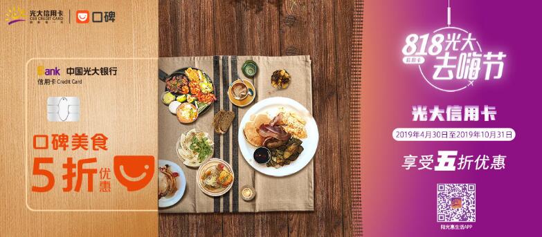 活動期間每周一至每周日,光大信用卡用戶且在支付寶實名認證個人用戶,在口碑平臺美食行業(yè)商戶處(休閑食品的商戶除外),使用支付寶賬戶綁定的光大銀行信用卡快捷支付進行當面付消費,有機會享受5折優(yōu)惠,最高15元優(yōu)惠封頂。活動期間每天限前8000個優(yōu)惠名額,名額有限,用完即止。活動期間同一用戶每月限享1次優(yōu)惠機會。(詳見陽光惠生活APP或口碑APP銀行卡特惠頻道,具體路徑見活動細則)。