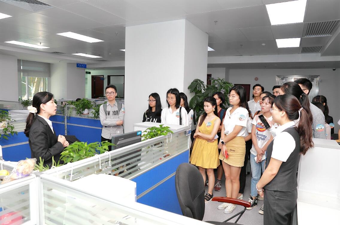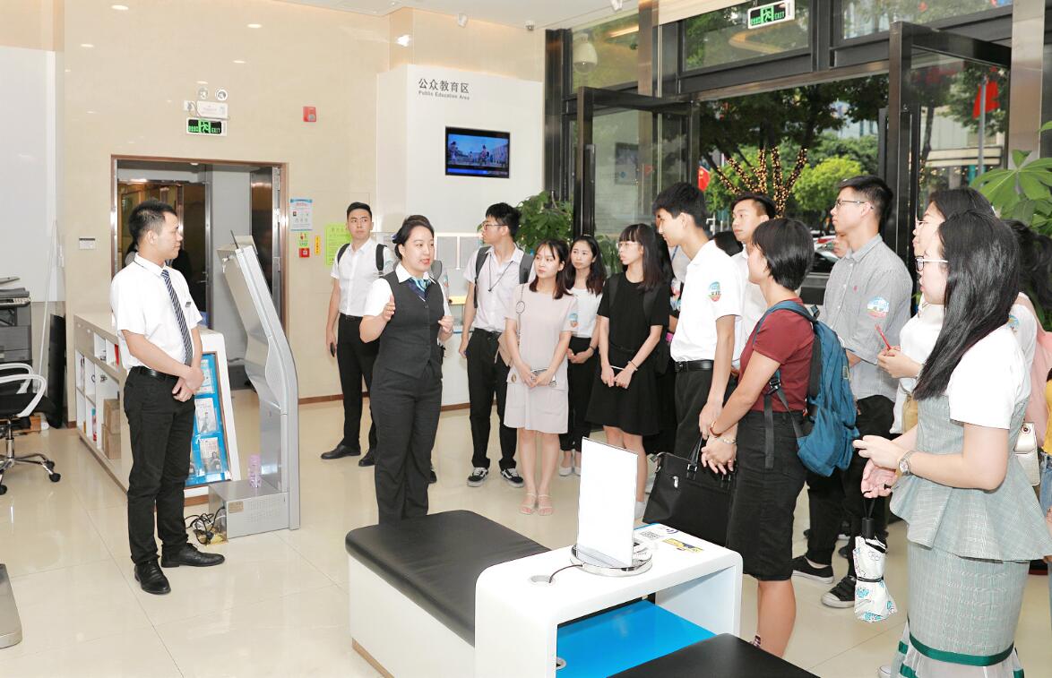 開放日活動的第二站,同學們來到沙井支行營業部、沙井坣崗支行和福田支行營業部學習了銀行營業網點功能區布局、窗口設置、營業場所裝飾、智能設備配置及人員安排等情況,對銀行營業網點的工作環境有了更直觀的感受和體驗。特別是在參觀沙井東塘支行的員工宿舍“職工之家”時,同學們對這個占地1500平米、總建筑面積3200平米的獨立大院由衷贊嘆,向往不已。