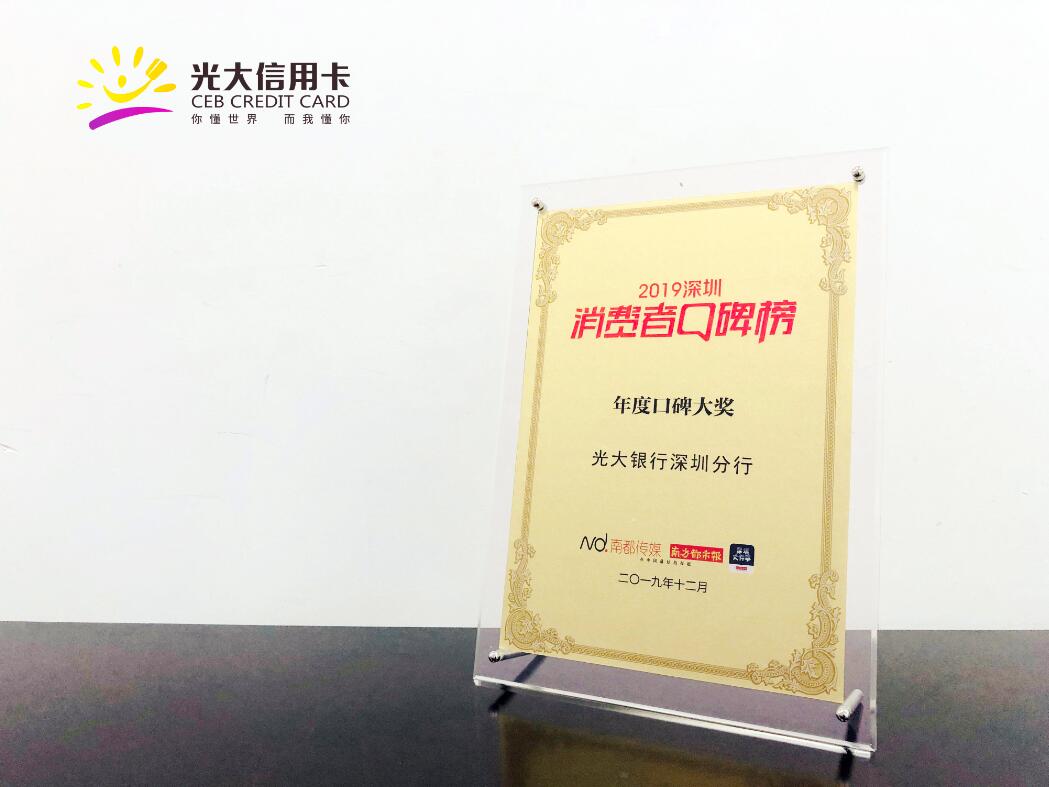 據悉,2019年12月18日,南方都市報舉辦“2019深圳商業品牌消費者口碑榜”頒獎典禮,光大銀行深圳分行榮登南方都市報“2019年深圳商業品牌消費者口碑榜”。