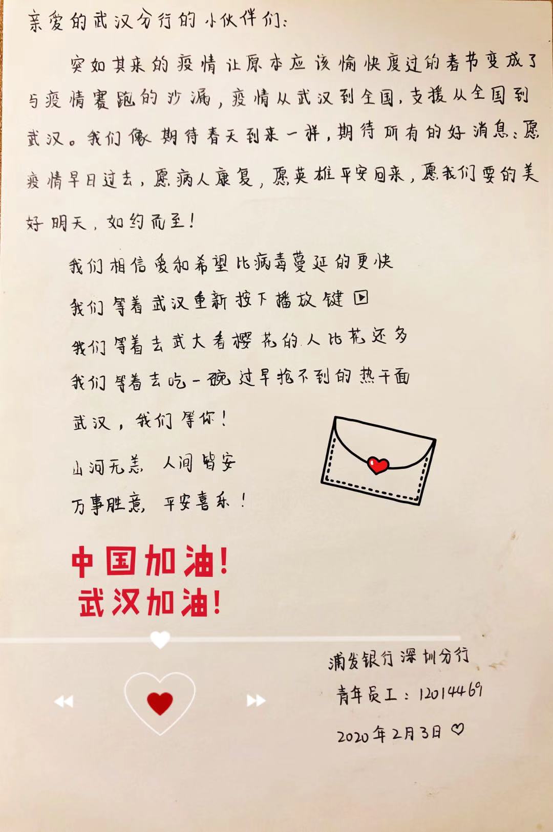 2月3日,浦發銀行深圳分行團委向全體青年員工發出了一封倡議書。在倡議書中,該行團委號召廣大團干部、團員青年立即行動,充分發揮黨的助手和后備軍作用,展現青年突擊隊作為,為堅決打贏疫情防控阻擊戰貢獻力量,并向青年提出三個要求:“堅定信心不迷茫,聽黨指揮勇擔當”、“科學防范不信謠,眾志成城控疫情”、“居家辦公不離崗,服從指揮勇擔當”。當日,浦發銀行深圳分行發起了給武漢分行同事寄送家書的活動,該行全體青年手寫家書,圖文并茂、紙短情長,表達了對疫區“戰友們”最深切的關愛和鼓勵,身體力行做好他們堅強的后盾。