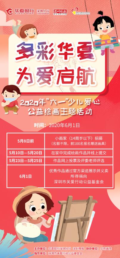 據了解,該活動是由華夏銀行深圳分行攜手深圳晚報、小燕畫院開展的“多彩華夏為愛啟航”少兒愛心公益繪畫。活動向深圳市民招募小畫家,邀請他們用手中畫筆描繪精彩世界。同時,將繪畫賦予公益與愛心,評選出部分優秀作品進行線上義賣,以點亮地貧兒童的生命之光。