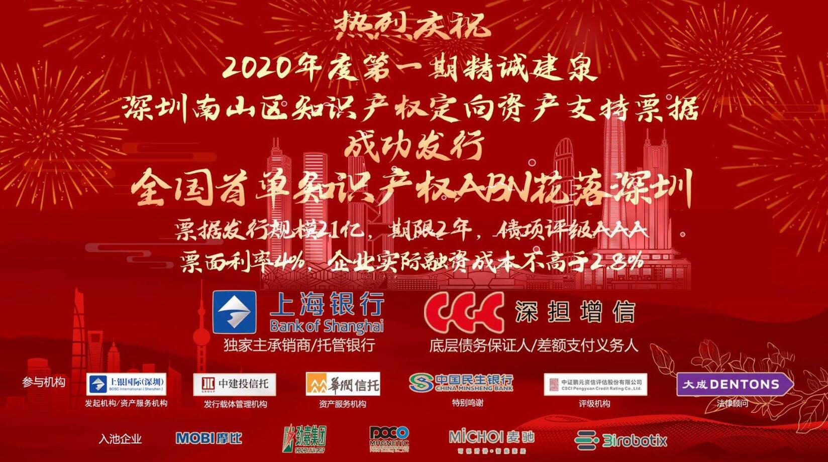 深圳新聞網·見圳客戶端2020年9月23日訊 昨日,隨著上海銀行股份有限公司主承的“上銀國際投資(深圳)有限公司2020年度第一期精誠建泉深圳南山區知識產權定向資產支持票據”成功發行,中國銀行間交易商協會首單民營科技中小企業專項知識產權ABN項目花落深圳。該項目不僅是對知識產權證券化的一次創新和實踐,也為中小民營科技企業開辟了一條在銀行間市場融資的新渠道。本期ABN共五家入池企業,發行規模2.1億元,期限兩年,票面4%,經南山區政府補貼和深圳擔保集團費用減免,入池企業實際融資成本低于年化2.80%。 一直以來,上海銀行以“精誠至上,信義立行”為核心價值觀,堅持“融智”與“融資”有機結合,以實體經濟需求為導向,不斷推進產品創新,持續為實體經濟發展提供更高質量、更有效率的金融服務。此次首單知識產權ABN項目花落深圳,不僅是深圳不斷強化金融創新所取得的重要成果,更是上海銀行探索服務深圳、服務實體經濟新模式的重要實踐。
