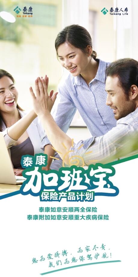 泰康加班寶保險產品計劃由《泰康如意安順兩全保險》及《泰康附加如意安順重大疾病保險》組成。主險泰康如意安順兩全保險產品提供身故及生存保障;附加險泰康附加如意安順重大疾病保險產品提供重疾、輕癥和輕癥豁免保費保障。