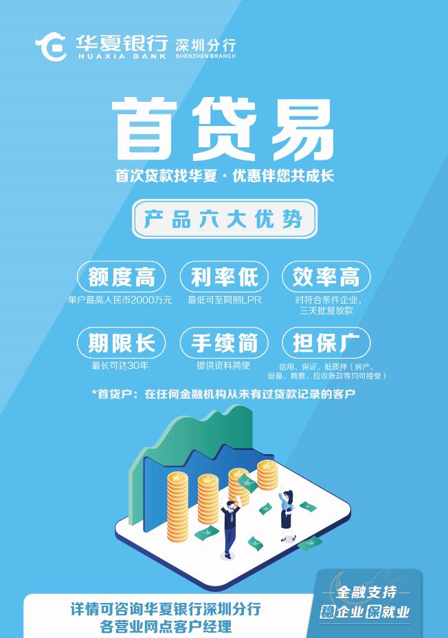 為滿足廣大中小微民營企業的資金需求,加大信貸投放精準滴灌,華夏銀行創新推出“首貸易”產品,向首貸戶(是指在任何金融機構從未有過貸款記錄的客戶)承諾“首次貸款找華夏,優惠伴您共成長”的全方面、定制金融服務。“首貸易”產品具有“六大突出優勢”,額度高、利率低、效率高、期限長、手續簡、擔保廣。