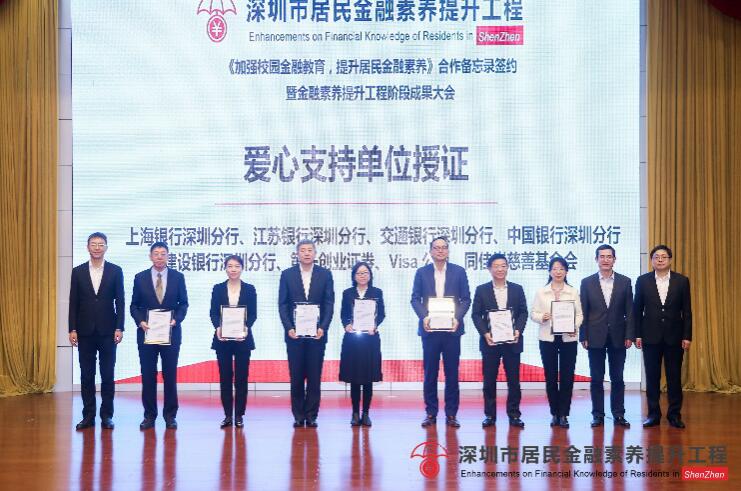 在隨后的授證儀式中,上海銀行深圳分行因對深圳市居民金融素養提升工程做出的突出貢獻,及推動深圳金融安全建設與可持續發展,被授予了“愛心支持單位”榮譽稱號。