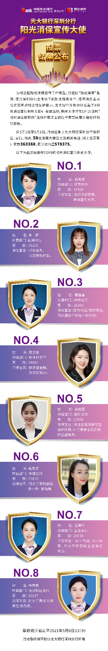 深圳新聞網·見圳客戶端2021年5月8日訊 昨日,光大銀行深圳分行“陽光消保宣傳明星大使”線上投票圓滿結束,從58名宣傳大使中投票產生了賴春妮、肖雨、曹晶晶、周之靖、黃曉霞、蔣易萱、曾粵玲、林思思8名陽光消保宣傳明星大使。明星大使將在5月15日的“陽光消保健康跑”活動開幕式上被授予榮譽勛章并接受行領導授旗。5月1日,光大銀行深圳分行發起了“陽光消保宣傳明星大使”線上投票,旨在樹立起陽光消保宣傳工作典型,打造“陽光消保”品牌,提升深圳分行全體員工的陽光服務水平,提高消費者風險防范意識和自我保護能力,提升光大在深圳地區的品牌影響力。投票活動得到社會熱烈響應,據統計,此次累計票數達363388次。