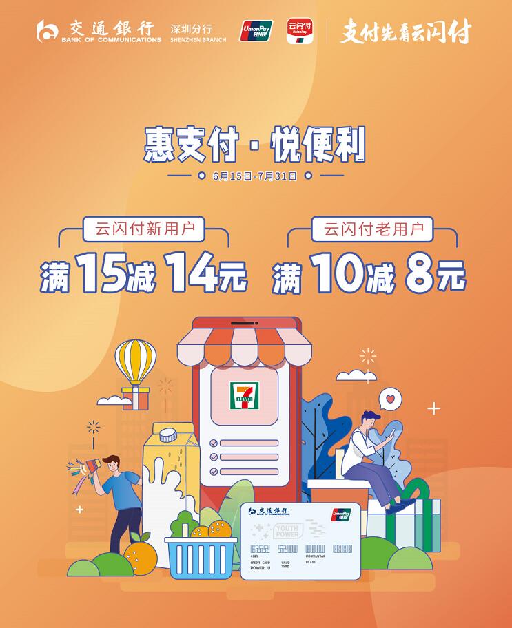 近日,交通銀行深圳分行、云閃付、7-Eleven攜手開展“惠支付,悅便利”活動,在7-Eleven用銀聯二維碼支付享立減優惠。