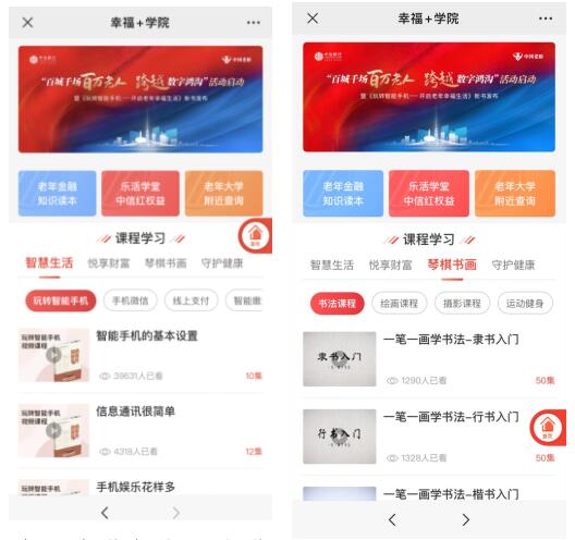 中信銀行專門給老年朋友準備的“課程學習”一共有智能生活、悅享財富、琴棋書畫和守護健康四大板塊,都是老年朋友需要和關心的內容,總課程2000余節,總時長超過1.8萬分鐘。