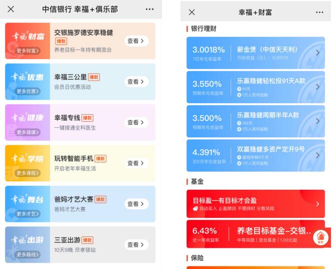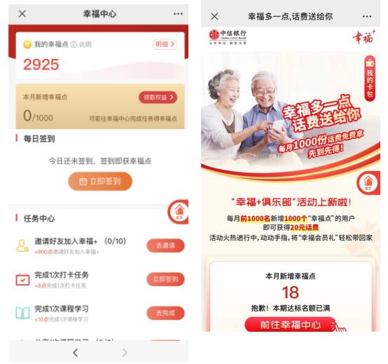 中信銀行“幸福+俱樂部”“幸福+財富”頁面展示