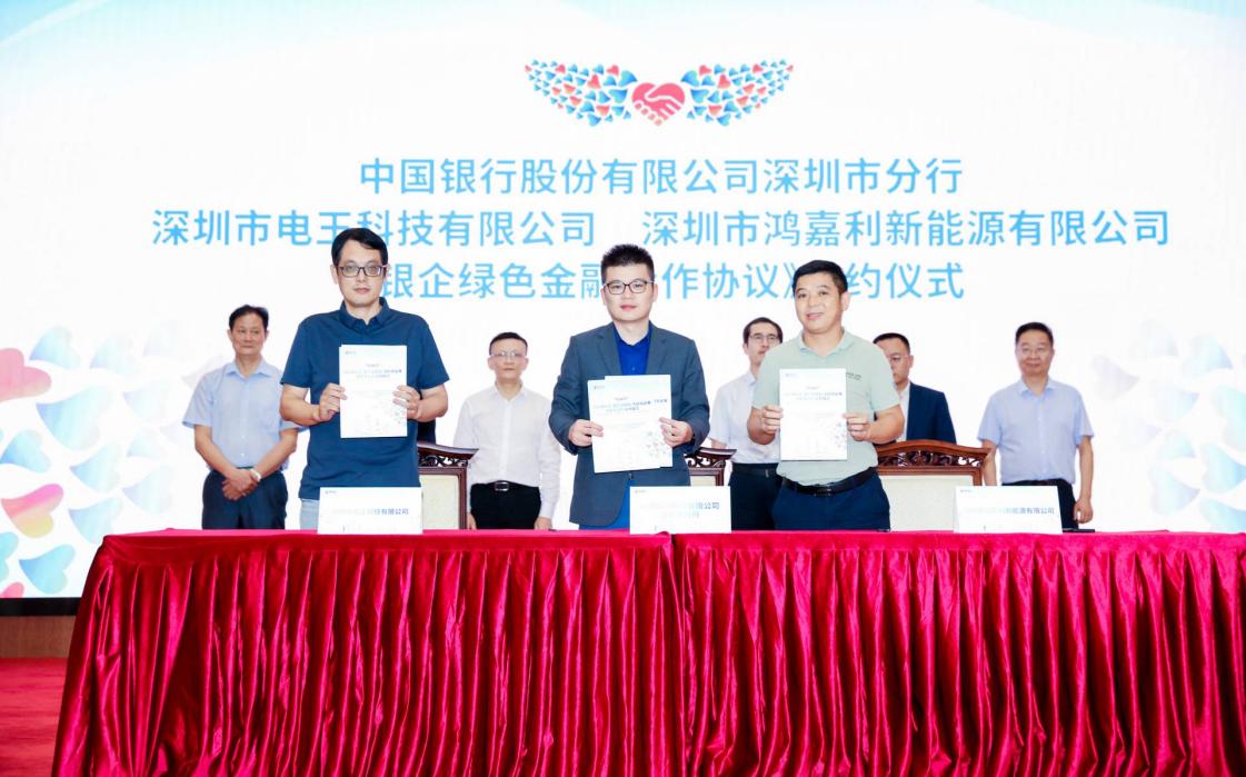 對接會上,以深圳中行為代表的五家金融機構分別對綠色金融政策進行宣講,表示將加強對綠色金融創新產品的探索和實踐,以金融力量助力綠色產業發展。深圳中行與深圳市電王科技有限公司、深圳市鴻嘉利新能源有限公司兩家代表企業簽訂《銀企綠色金融合作協議》,將普惠金融與綠色金融有機融合,在節能節電、新能源等領域積極支持企業綠色發展。