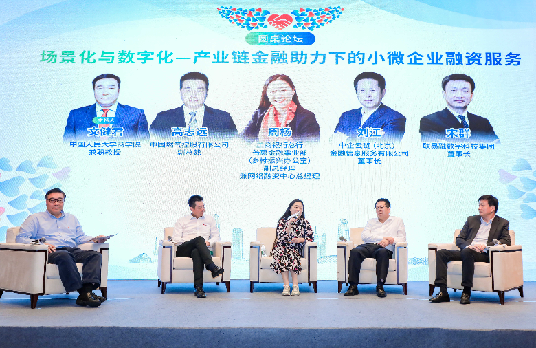 在論壇對話環節,工行總行普惠金融事業部副總經理兼網絡融資中心總經理周楊、核心企業代表中國燃氣控股有限公司副總裁高志遠、供應鏈服務機構代表中企云鏈(北京)金融信息服務有限公司董事長劉江和聯易融數字科技集團董事長宋群共同探討了如何以融合和創新方式,通過產業鏈金融助力小微企業融資服務,互相交換在產業鏈金融發展方面的經驗和智慧。