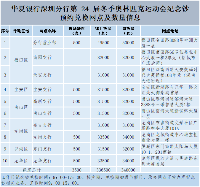 華夏銀行深圳分行共10家網點承辦冬奧紀念鈔發行工作。為方便老年客戶預約紀念鈔,該行7家網點開放線下預約,市民可持有效的第二代居民身份證原件至公告的現場預約網點辦理預約。紀念鈔先到先得,額滿為止。