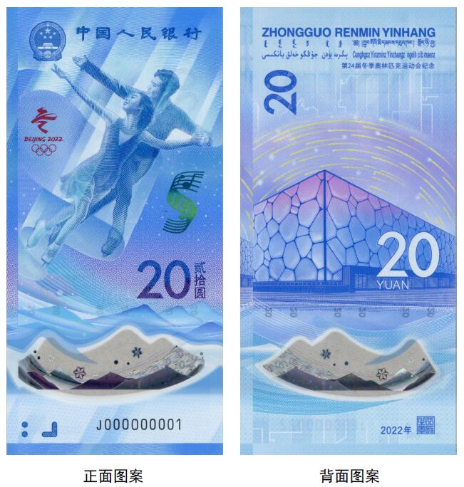 正面圖案:正面主景為花樣滑冰運動員圖案,上方為中華人民共和國國徽、“中國人民銀行”行名,左側為第24屆冬季奧林匹克運動會會徽,右側為光彩光變樂譜圖案、面額數字“20”與漢字“貳拾圓”,下方為動感全息圖案、透明視窗、盲文面額標記和冠字號碼。