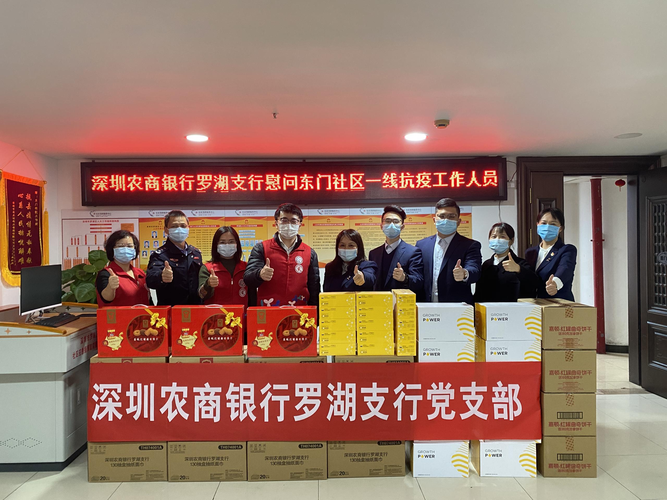 雖不能上前線抗疫,但作為羅湖區的本地金融企業,在看到抗疫人員的辛苦付出后,深圳農商銀行羅湖支行主動發起“情暖疫線,羅湖加油”活動,轄下各網點員工在做好疫情防控前提下,為一線抗疫人員送上曲奇餅、紙巾、礦泉水等溫暖物資,慰問抗疫人員,積極履行作為金融企業的社會責任。截至目前,活動共覆蓋羅湖草埔東、蓮塘、黃貝嶺等八個社區,并在繼續開展中。