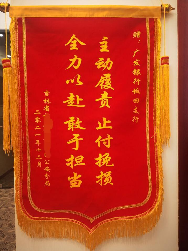 深圳新聞網2022年1月18日訊(記者 朱琳 通訊員 金橋)近日,廣發銀行深圳分行機智識別某公司賬戶涉嫌電信詐騙,成功堵截高達412萬元的涉案資金轉移。吉林省某市公安分局向該行授予錦旗,對該行有效保障人民群眾財產安全的行為給予了高度肯定。