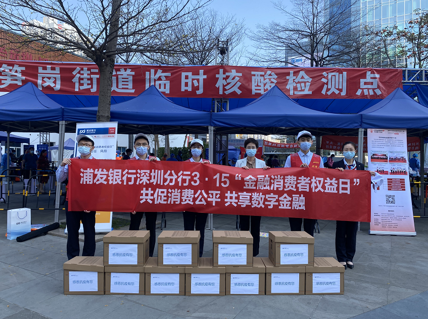 本次“消保防疫關愛站”系列活動主要分布在羅湖區、福田區、南山區、龍崗區、龍華區、寶安區。活動當天,在嚴格做好防疫措施的情況下,浦發銀行志愿者們身著“消費者權益保護代言人”的紅馬甲,分別在多個核酸檢測點建起“消保防疫關愛站”,現場給醫護人員和等候檢測的市民送上“防疫關愛包”——包括“防疫、消?!睈坌奶崾尽⒎酪呖谡帧?5%酒精消毒巾??紤]到醫務人員在高溫天氣長時間身著防護服,志愿者們還定制了“最美抗疫先鋒”飲品以及其他物資,獻給這些不辭辛苦的一線工作人員。志愿者們表示,該活動一是為了給排隊等候較久的市民送上防疫愛心關懷,給長期堅守在抗疫一線的醫務人員送去衷心的慰問。二者也借3.15消費者權益保護日之機,給市民和醫護人員開設一堂金融知識小課堂。