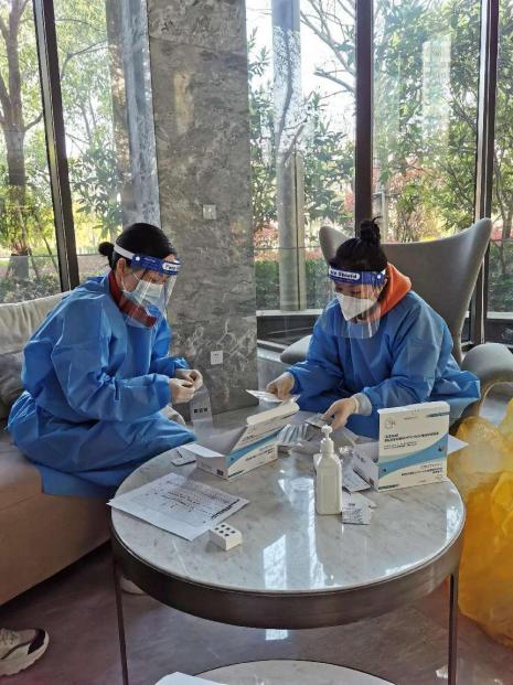 上圖:廖銘(左)和曲歡壽(右)在寶騰核酸檢測機構做志愿服務