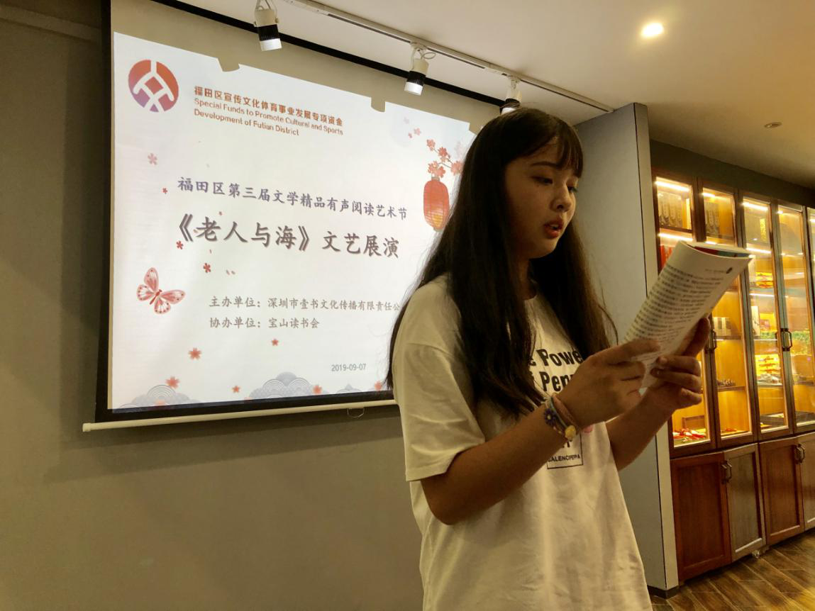 深圳新聞網(wǎng)訊 2019年9月7日,由深圳市壹書(shū)文化傳播有限責(zé)任公司主辦、寶山讀書(shū)會(huì)協(xié)辦的“福田區(qū)第三屆文學(xué)精品有聲閱讀藝術(shù)節(jié)”之《老人與海》閱讀分享會(huì)暨文學(xué)作品朗誦會(huì)在簡(jiǎn)閱書(shū)吧香蜜湖店成功舉辦。來(lái)自深圳市寶山技工學(xué)校的學(xué)子們?cè)谥髦v人的啟示下分享閱讀感悟、誦讀精彩文摘,在文藝展演中體會(huì)圣地亞哥抗擊命運(yùn)的人生哲學(xué)。