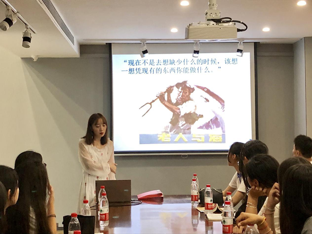 《老人與海》通過(guò)講述一個(gè)老漁夫的故事,揭示了人類(lèi)共同的命運(yùn),給讀者帶來(lái)關(guān)于勇氣、不屈不撓、與命運(yùn)作斗爭(zhēng)的精神啟迪。圍繞“生而為人,請(qǐng)務(wù)必戰(zhàn)斗到底”這一主題,邵洋提出了“是選擇放棄,還是一往直前?”這一問(wèn)題,引起在座同學(xué)的思考。隨后,她又通過(guò)解讀《老人與海》中的喻象與藝術(shù)、生命與理想,為同學(xué)們總結(jié)值得學(xué)習(xí)的寫(xiě)作思路。