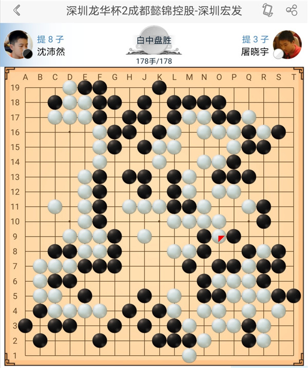 第四臺小將沈沛然執黑對陣屠曉宇,行至178手時,盤面形勢白微弱領先。大家認為若努力收官或許有一線希望時,沈沛然停鐘認輸,也許是看清了形勢的無奈之舉吧。