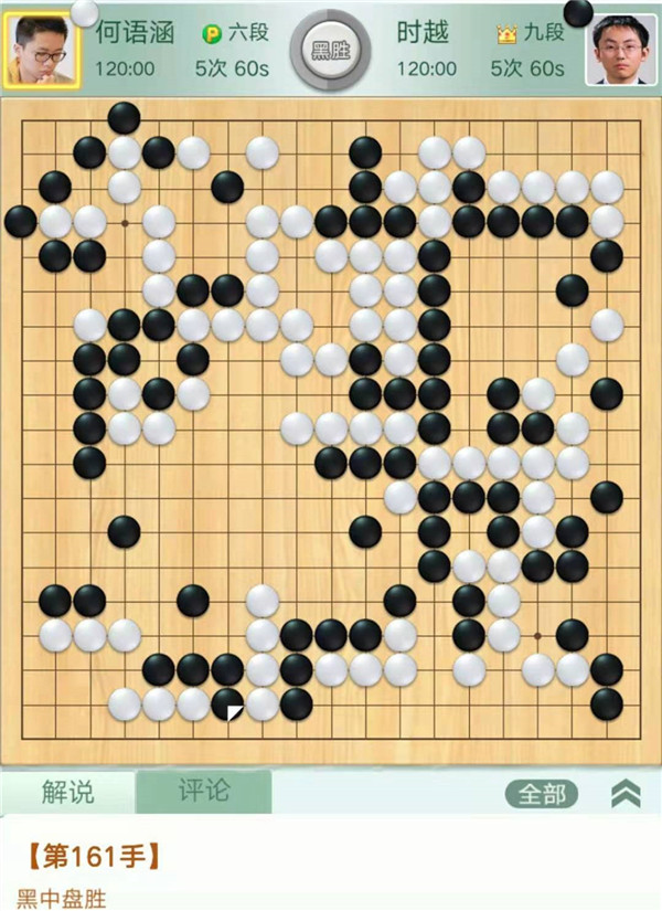 緊接著,一臺時越九段執黑對何語涵六段干凈利落,時越在對局中充分發揮自身勢大力沉的棋風,以凌厲的屠龍刀法絕殺一條大龍,痛快淋漓地結束了戰斗。關鍵節點在中盤,黑棋對右邊白子簡單吃住尾巴則優勢,實戰黑棋追求整體殺白,白棋應對失誤大龍憤死,行棋161手。