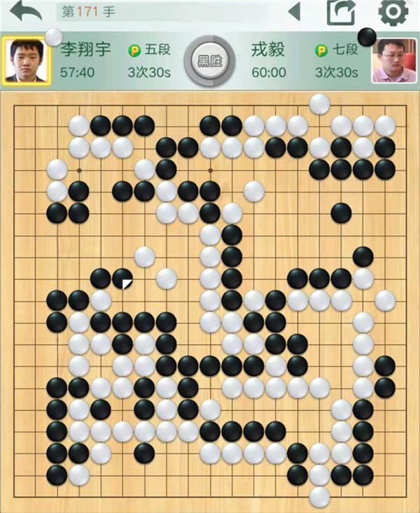 今日比賽中,三臺快棋戎毅執黑對陣小將李翔宇,黑棋下方作戰失利早早進入敗勢。后來白棋中央突然將自己大龍走死,黑棋幸運獲勝,行棋171手。