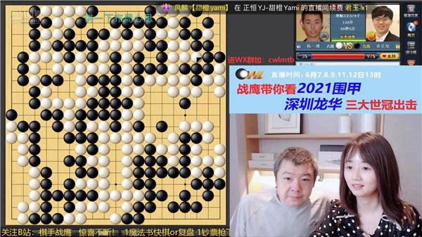 今日大局好,教練羅洗河心情自然好。于是興高采烈地去虎牙直播和戰鷹侃棋了。戰鷹是職業二段,女子圍甲主力選手,人美、棋強、口才好,虎牙直播間圍棋知名主播,是深圳龍華隊網上直播合作人。深圳龍華隊后續比賽將持續在虎牙平臺直播,歡迎大家關注哦!