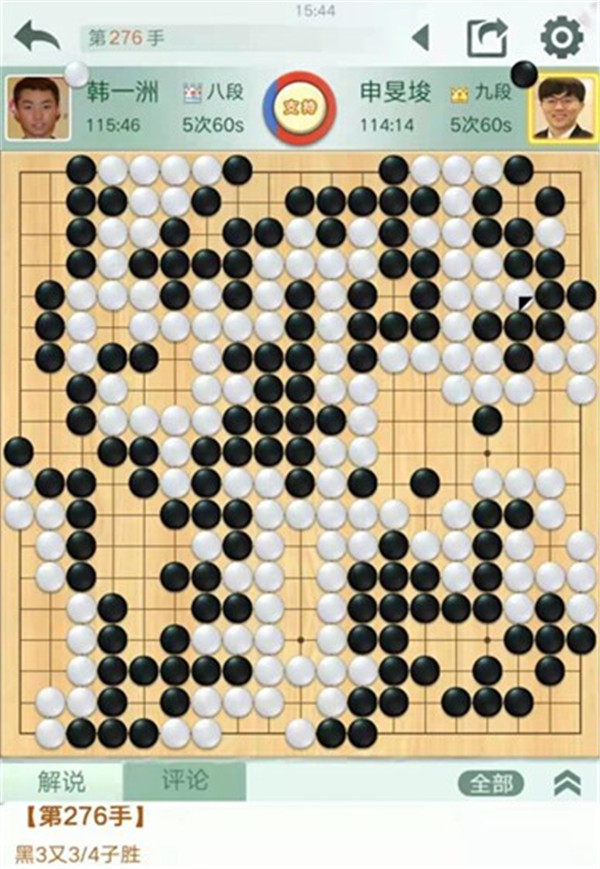 申旻俊主將執黑對陣小將韓一洲,布局局面接近。進入中后盤后,白方明顯功力不足,小失誤不斷。黑棋優勢逐漸擴大,最終以較大差距獲勝。