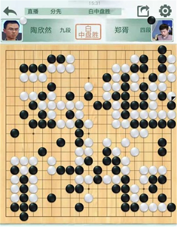 陶欣然執白對陣小將鄭胥。黑棋開局在左邊虧損,局面落后。最后黑棋在右邊破釜沉舟尋求戰機,白棋計算精準,將黑全殺,白中盤勝。