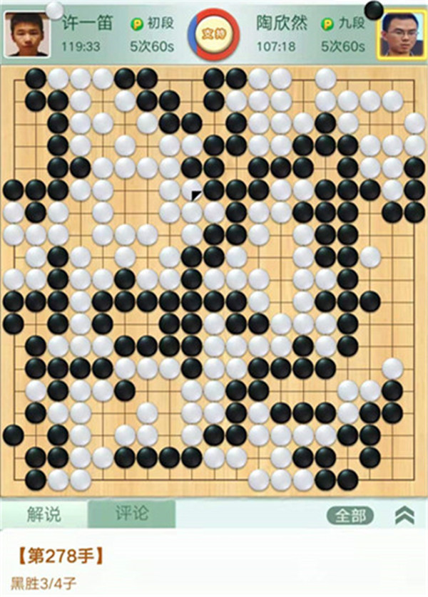 陶欣然執黑對陣新初段許一笛。開局下邊黑棋稍虧,之后在左下角獲得便宜黑棋領先。大官子黑棋有所失誤局勢又是白好。之后小官子時候白棋又有失誤,黑棋幸運的3/4子獲勝。