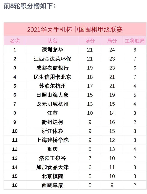 見圳客戶端?深圳新聞網2021年6月8日訊(記者周錦春)華為手機杯男子圍甲聯賽第八輪今日繼續在浙江長興鏖戰。繼昨日的3:1大捷,深圳龍華隊今日更是神勇無敵,以4:0完勝洛陽玉泉谷隊,重回積分榜榜首!老冠軍江西隊主將7連勝終于止步在第八輪,短暫占居榜首后今以1分局分之差位居第二。