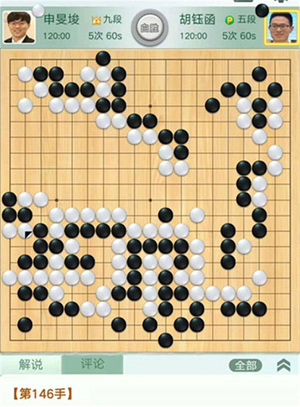 申旻俊主將執白對陣胡鈺函。白棋發揮堪稱完美,優勢不斷擴大,最終黑棋不顧自身薄弱在左下攪局,白棋應對正確黑棋崩潰。