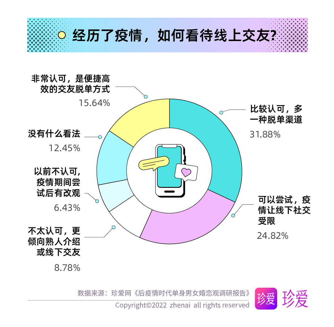 讀特客戶端·深圳新聞網(wǎng)2022年6月14日訊(記者 葉梅)疫情讓人們的生活狀態(tài)、工作方式和個人習(xí)慣都發(fā)生了顯著變化,而對單身人群而言,疫情三年他們對感情的態(tài)度又有哪些改變?現(xiàn)在的他們?nèi)绾慰创H密關(guān)系?珍愛網(wǎng)聚焦后疫情時代單身人群的婚戀觀發(fā)起調(diào)研,探究疫情期間單身人群在戀愛期待、擇偶標準、脫單難度等方面的變化。本次調(diào)研共回收問卷9862份。