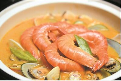 在東莞某國際大酒店,掌勺主廚將新鮮九節蝦去掉蝦腸洗凈,土豆切丁入油鍋香炸備用。熱鍋中放蔥蒜粒、洋蔥片和青紅椒片炒香,加入適量用雞肉與排骨熬就的高湯,倒入咖喱粉煮滾。依序滑入白貝、青口和九節蝦水燜煮去腥,待九成熟時分別撈起,以盡量保持海鮮的鮮嫩度。砂鍋底部平鋪一層炸好的土豆,分層碼上貝類、青口等海鮮,再淋透上熬好的香濃咖喱汁,海鮮鍋即大功告成。入口酸酸辣辣十分刺激開胃,輕而易舉激活味蕾。