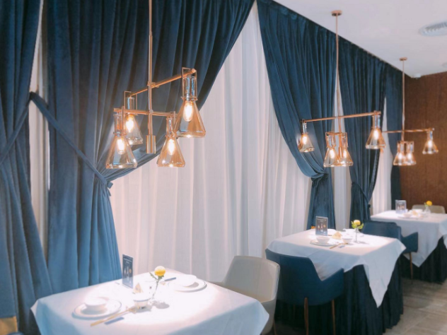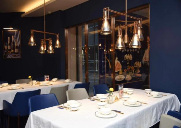 密室的大門,區隔開的完全是兩種不同的風格。實驗室風格VS LOFT風,密室玩的是神秘的科學實驗室氛圍,大堂則是完全敞亮通透的空間,整體以大叔紳士藍、玫瑰金為主色調,線條利落的天花板吊頂,吊燈暖暖的光線投射在擺放講究的餐具上,浪漫又小資,再搭配大理石紋水泥地磚、木紋墻藝等,讓整個空間保持和諧統一的氛圍,又展現出豐富的層次感。廚房直接采用明檔的空間設計,衛生情況一目了然,除了大堂,還設有特色VIP室和半透明宴會廳,適合有重要會談和生日宴會需求的朋友。