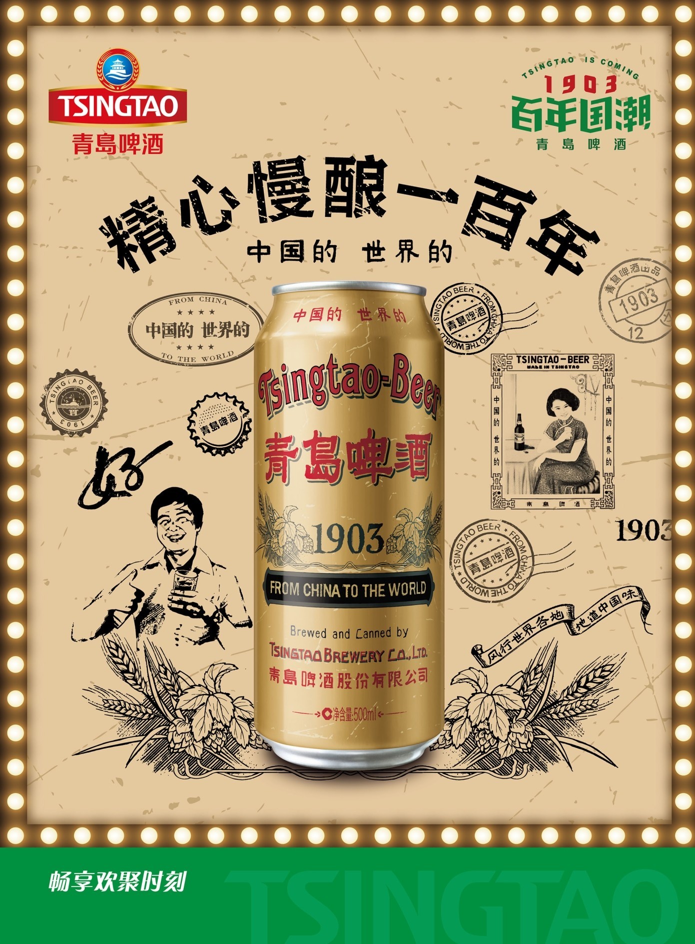 經典1903國潮罐是青島啤酒“向經典致敬,再造精釀傳奇”理念下推出致敬經典的力作,采用青島啤酒1903年“兩段法低溫長時間慢熟”獨特且傳統的釀造工藝,始終堅持工匠精神,從原料篩選到工藝釀造的每一個環節,都像雕琢藝術品一樣精致打磨,精心慢釀,造就了麥香濃郁醇香四溢的口感和體驗,其罐體復刻了百年前經典瓶貼畫面的匠心細節,復古元素與國際時尚潮流融于一體,是復古和時尚的典范。