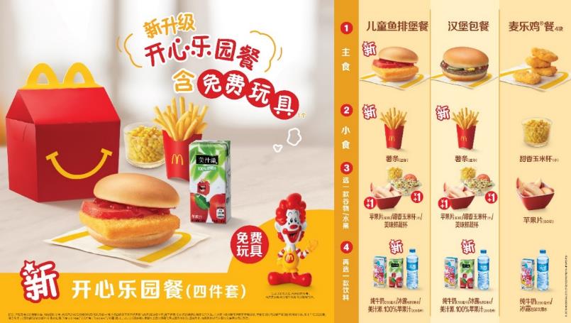 在確保產品美味與質量的前提下,麥當勞一直致力于實現更少鹽、更好油、更多蔬果谷物。新開心樂園餐參考了“麥當勞全球兒童營養標準”,并充分考慮了中國兒童的膳食營養需求。新套餐從三件套升級為四件套,包括一份主食 (可選肉類蛋白來源:魚、牛、雞)、一份小食 (可選迷你薯條、玉米杯)、一份蔬果 (可選蘋果片、鮮蔬杯、玉米杯)和一份飲品 (可選純牛奶、水、100%蘋果汁 )。