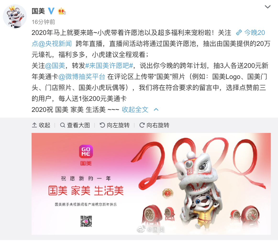 跨年就是要大聲說出你的心愿,趕快@國美幫你圓夢。活動當天,國美官方微博將與央視新聞同步抽獎,2019年12月31日17點起至2020年1月1日不同時間段抽取多項大獎,其中最高獎項為價值2020元國美美通卡1張。