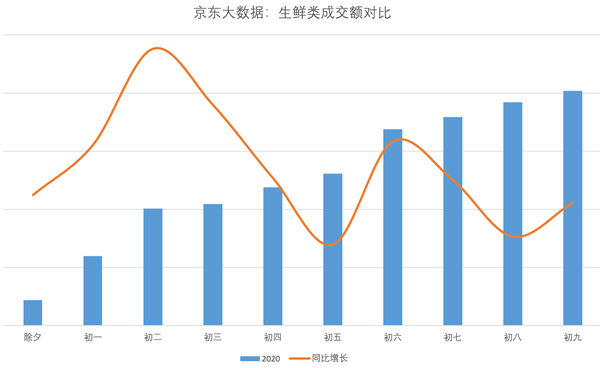 今年春節,線上生鮮品類的需求量大幅增長。京東大數據顯示,整個春節期間,京東生鮮成交額同比增長215%,為消費者提供了近1.5萬噸生鮮產品,蔬菜成交額同比增長近450%。在京東到家平臺上,除夕至大年初九,糧油副食商品銷售額同比去年春節增長736.40%,肉品同比增長711.11%,休閑食品增長527.16%,蔬菜增長441.1%,水果增長378.8%,米面糧油、肉禽蛋奶、蔬菜水果和水餃餛飩等速凍食品均十分暢銷。