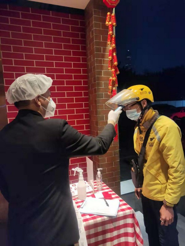 為了保障顧客和員工的健康,深圳西貝要求所有上班前的員工都需每半小時測一次體溫,每一個小時集中進行洗手消毒,公司還為每一位員工配備了符合要求的防護口罩。不僅如此,來外賣取餐的騎手也和店員分割開在店門口取餐,減少人員之間相互交流與接觸,每個騎手取餐前,必須接受體溫測量,手部消毒,確認無誤,才可取餐。