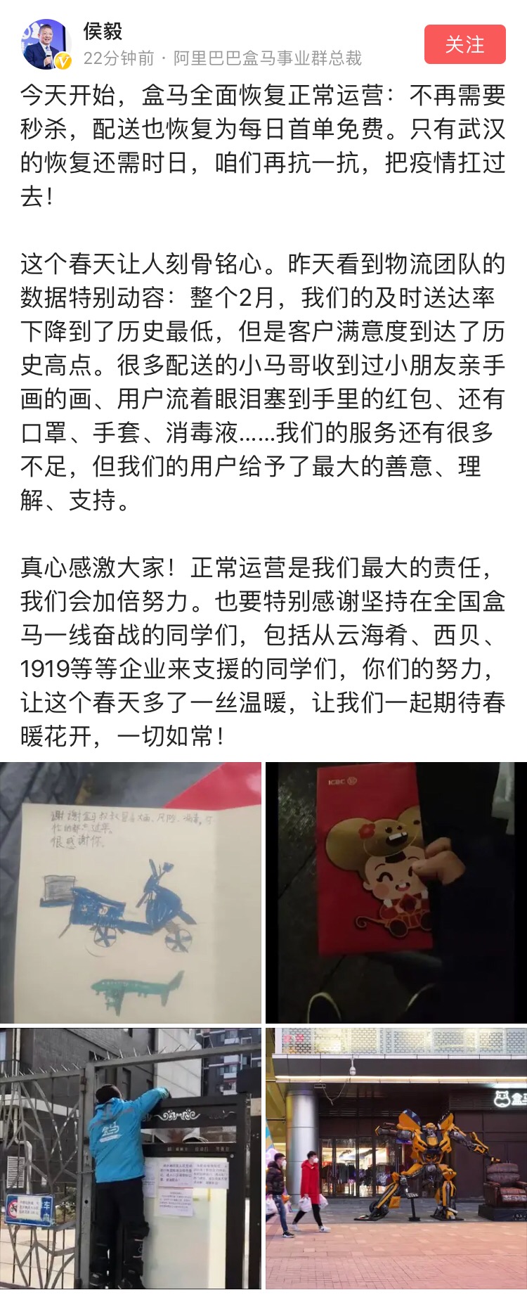 盒馬總裁侯毅在其社交平臺賬號上表示,盒馬全面恢復正常運營了,用戶也可以告別秒殺了,“疫情期間,正常運營是我們最大的責任,我們會加倍努力。武漢的恢復還需要一些時間,大家一起再抗一抗,把疫情扛過去。”